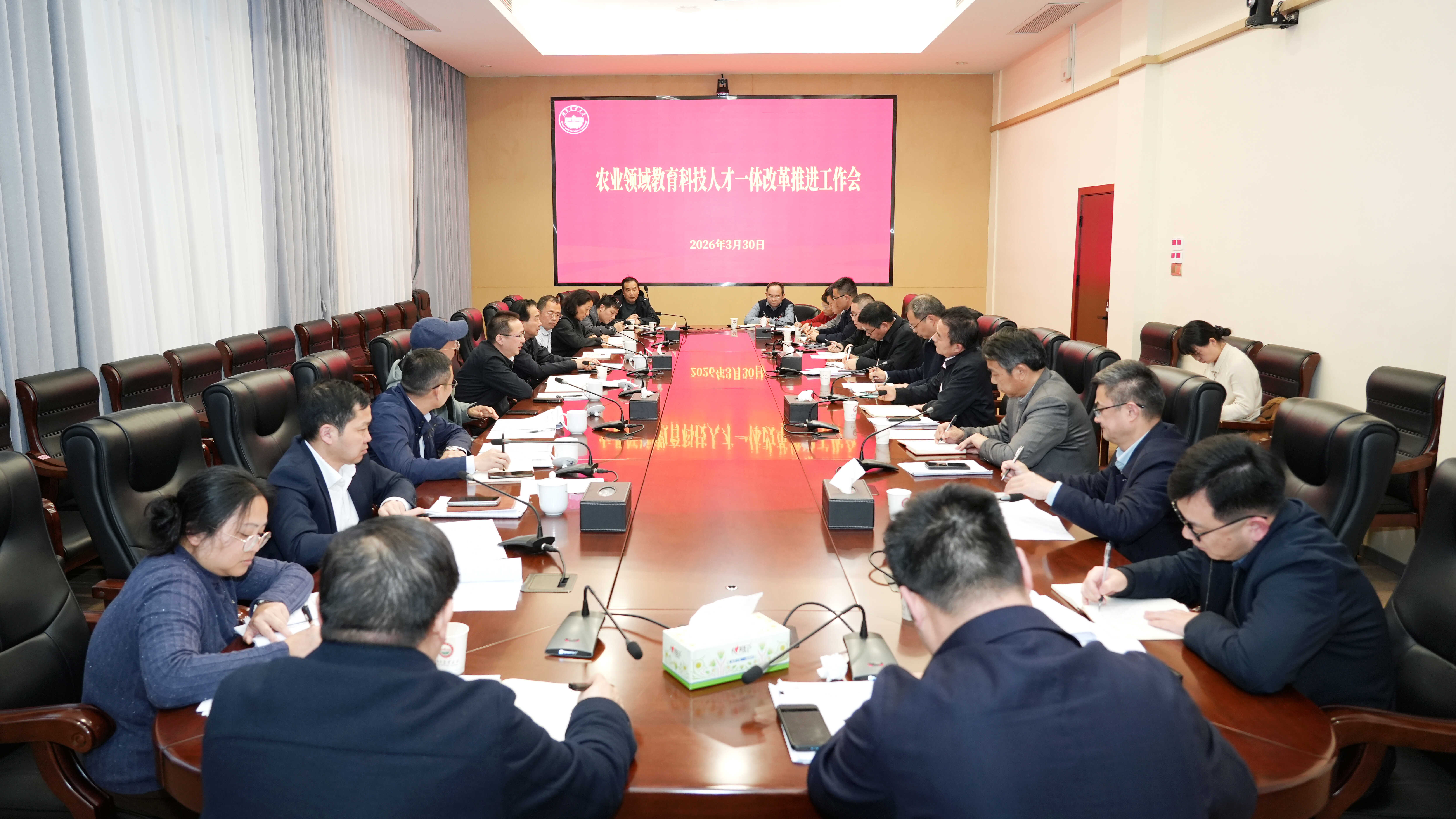 本网讯 (宣传部 青晓彤)3月30日下午,学校召开农业领域教育科技人才一体改革推进工作会,部署改革推进举措与重点任务,进一步压实工作职责。校党委书记兰勇主持会议并讲话,校领导陈光辉、谢方平、杨国顺、覃红燕、彭清辉、伍小松出席,我校和湖南省农业科学院相关单位负责人参加。