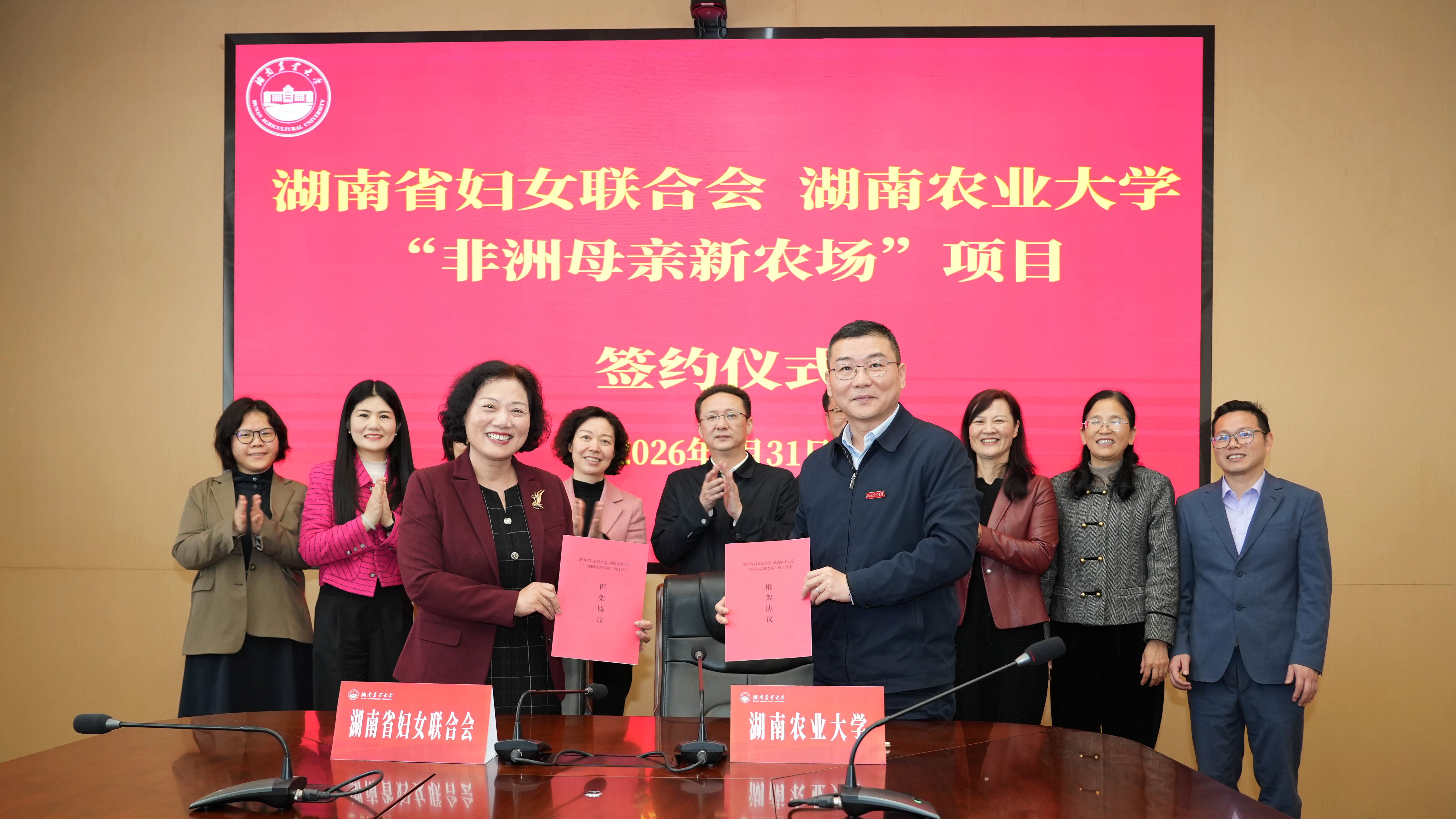 本网讯(国际交流与合作处 杨莉莉)3月31日,湖南省妇女联合会、湖南农业大学共建“非洲母亲新农场”项目座谈交流暨签约仪式举行。湖南省妇联党组书记、主席杨兰英,我校党委书记兰勇,省妇联一级巡视员卢妹香等出席活动。校党委委员、副校长彭清辉主持活动。