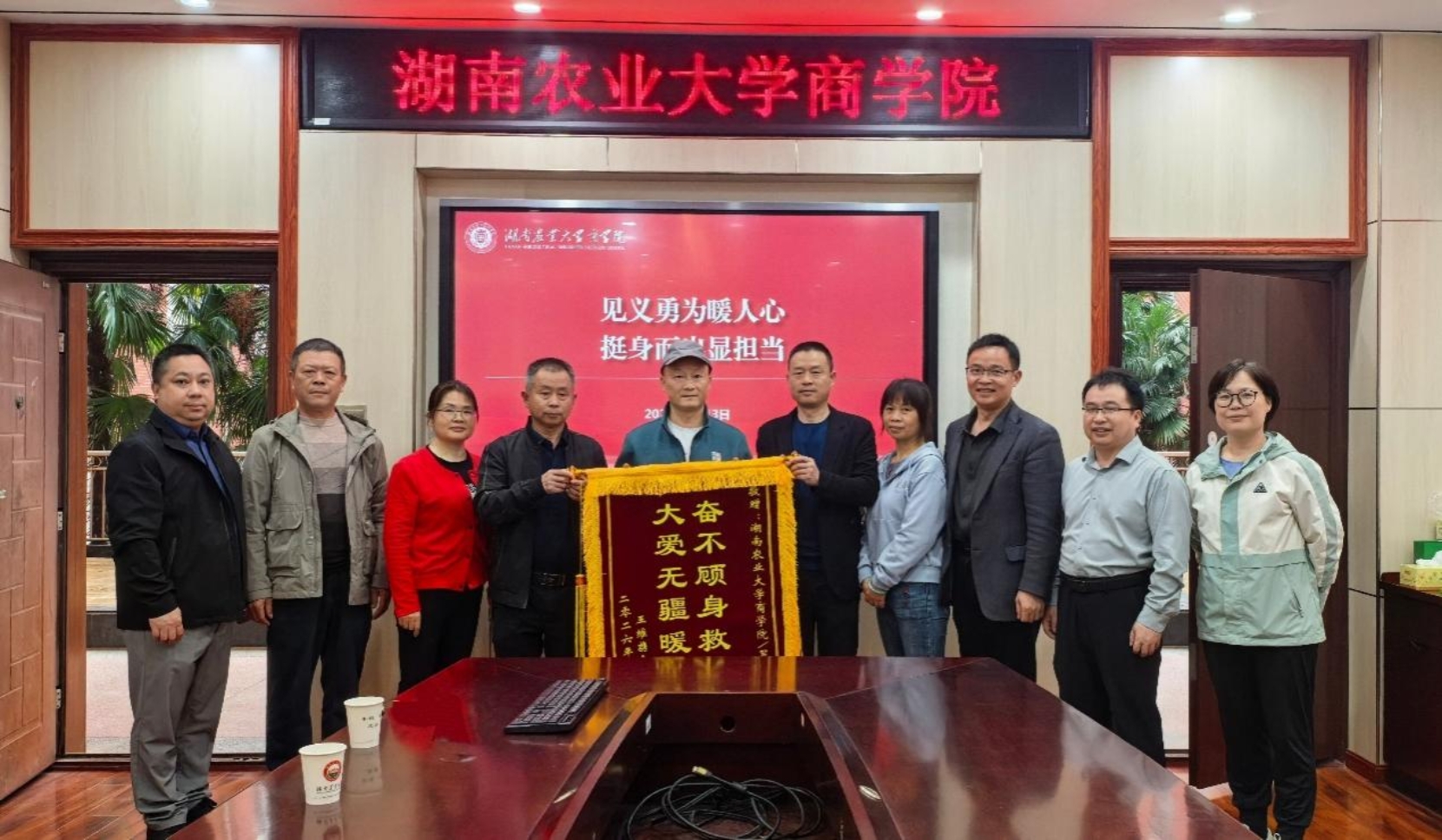本网讯(商学院 王昭静)4月13日,市民王维携家人专程来到商学院,将一面写有“奋不顾身救危难,大爱无疆暖人心”的锦旗送到教师罗祥泽手中,感谢他救起家中落水老人的义举。“我们全家真的非常感谢罗祥泽老师,如果没有他,都不敢想象我妈妈会发生什么。”老人的儿子王维感激地说道。