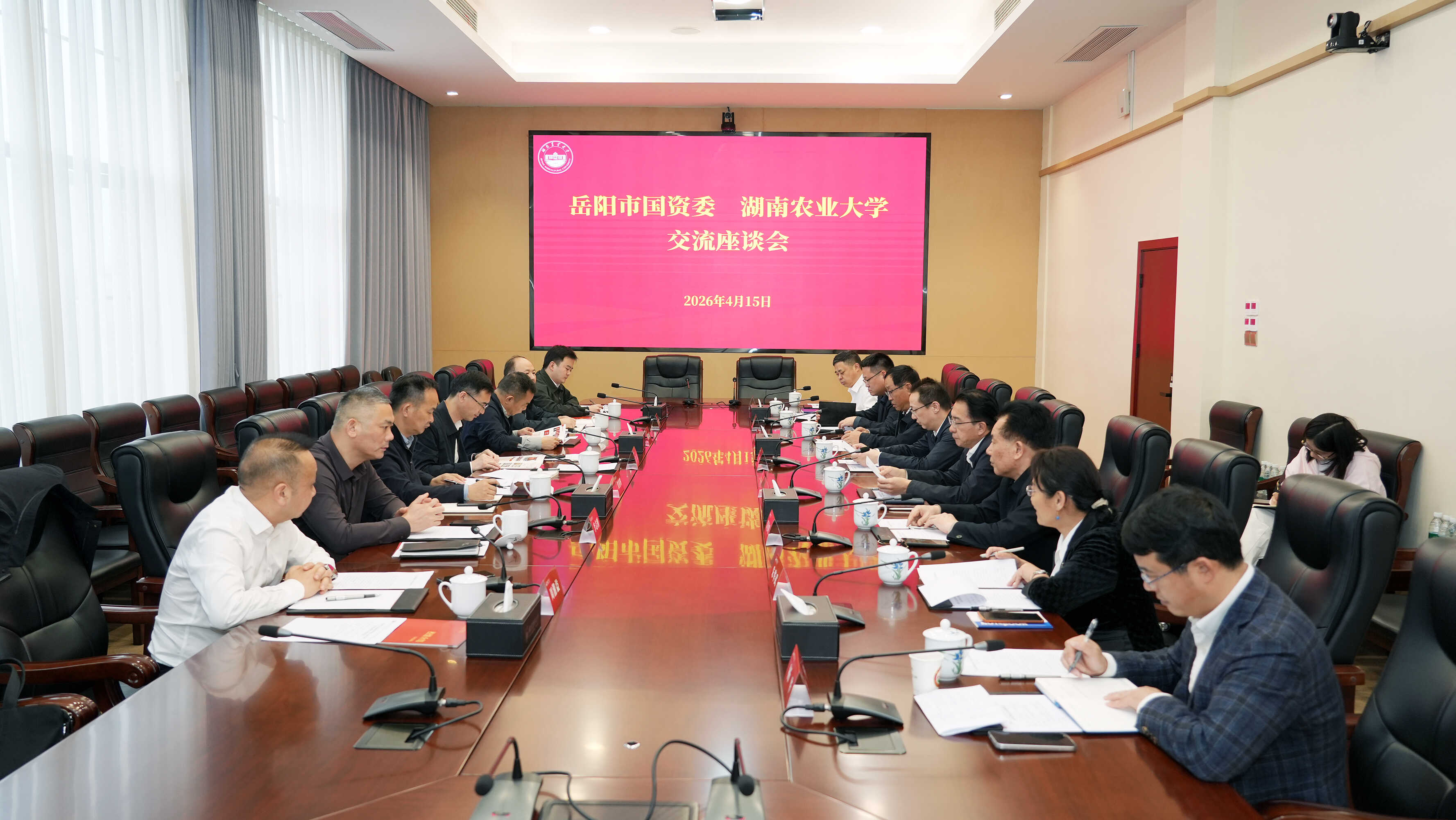 本网讯(宣传部 杨思)4月15日下午,岳阳市国资委党委书记、主任吕乐一行来校调研座谈。双方围绕深化校地合作、推动现代农业产业提质升级开展深入交流。校党委书记兰勇,党委副书记陈光辉,相关职能部门及学院负责人出席座谈会。