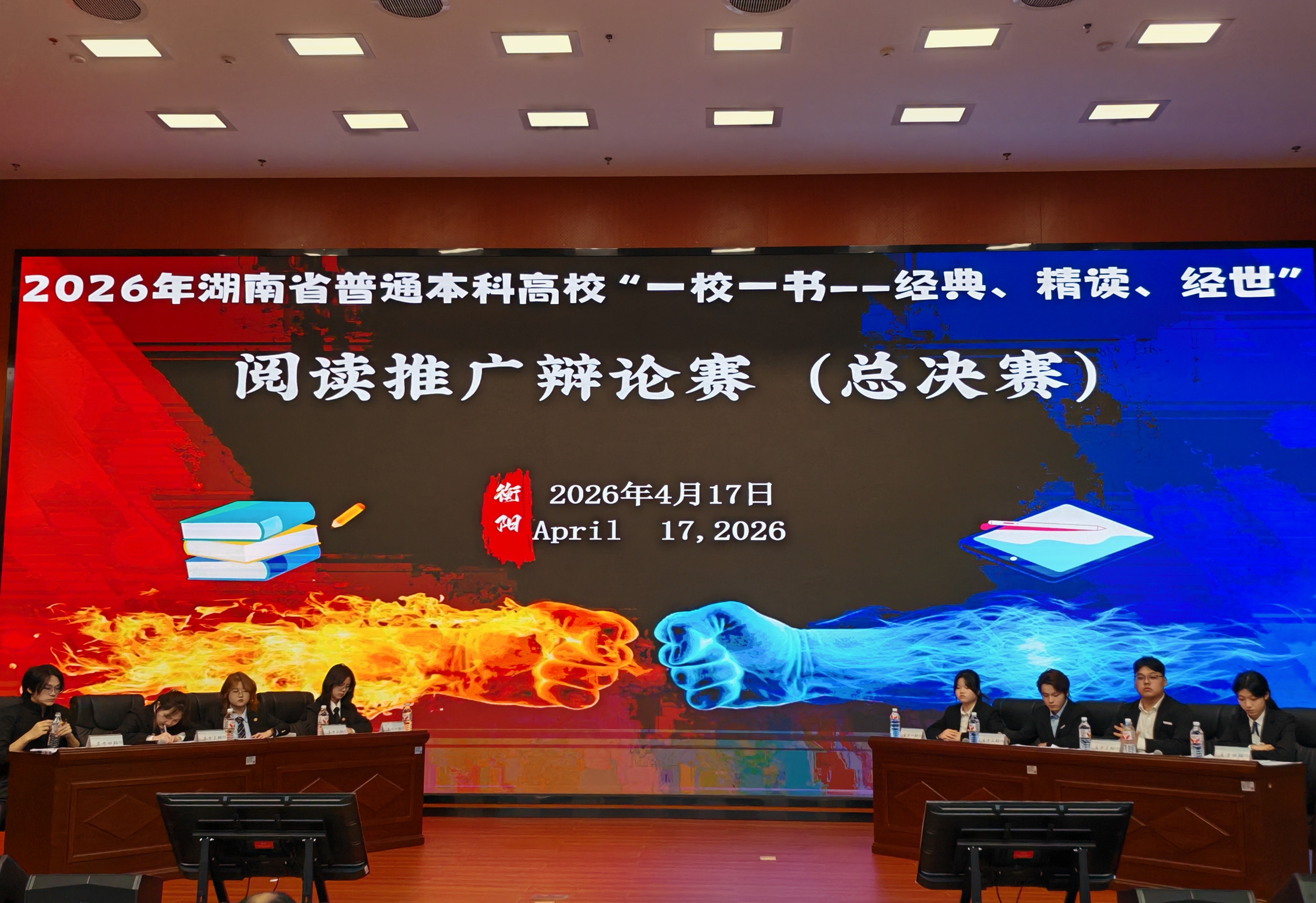 活动期间举办了2026年湖南省普通高校“一校一书”阅读推广师生辩论赛总决赛,该赛事以“经典守正与创新破局”为主题,面向全省普通高校图书馆馆员与全日制本科生组队竞技。我校代表队一路过关斩将,从全省32支参赛队伍中脱颖而出,最终获得冠军。